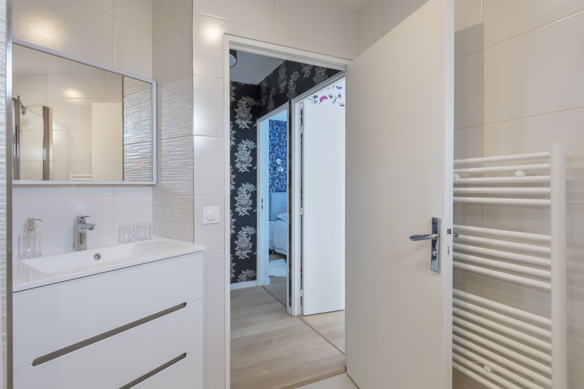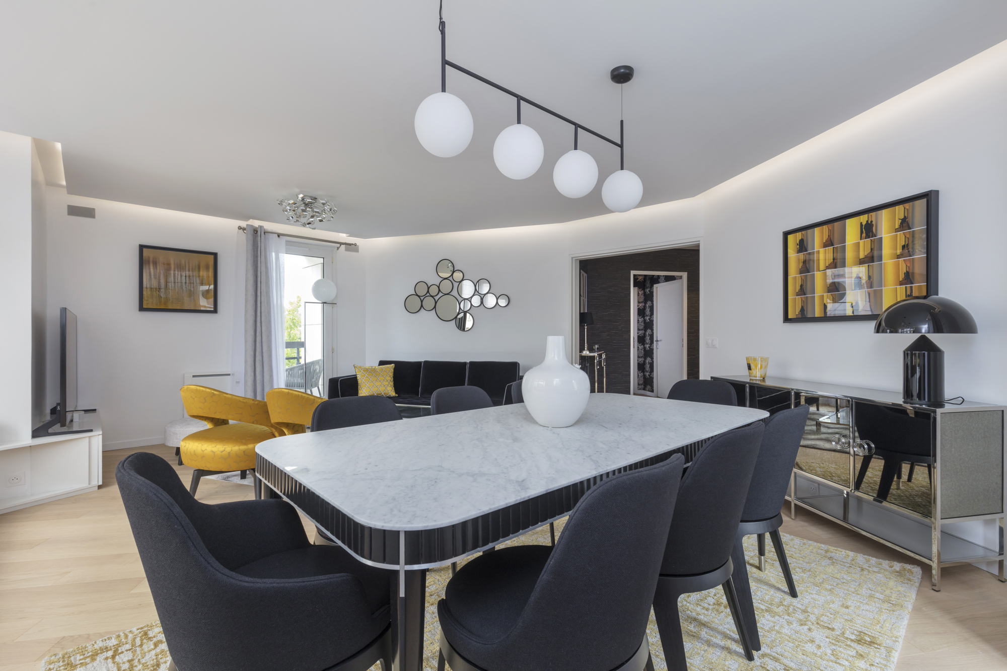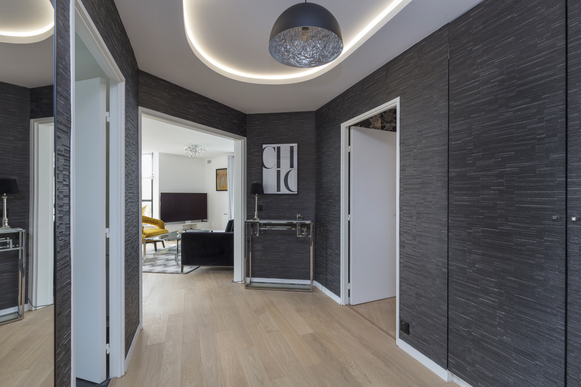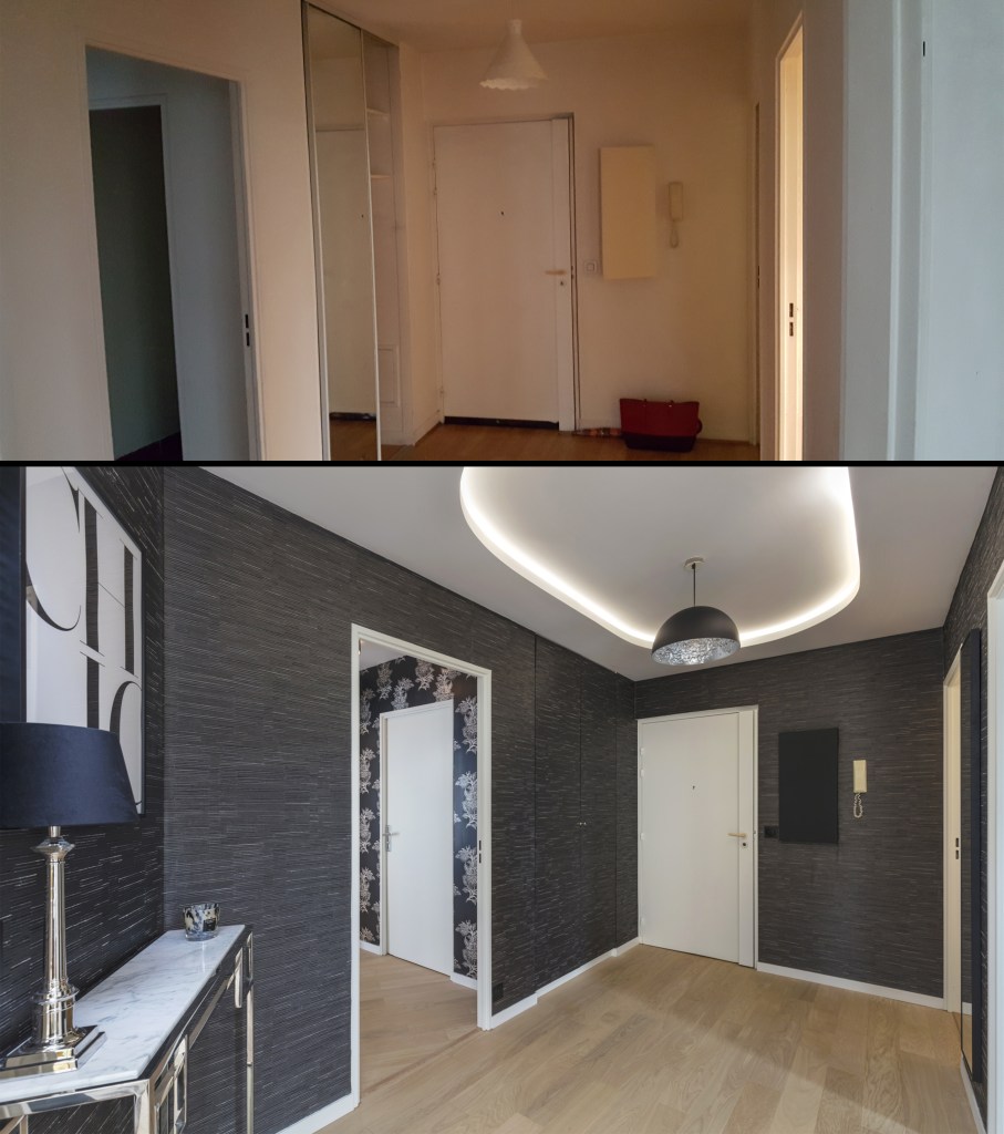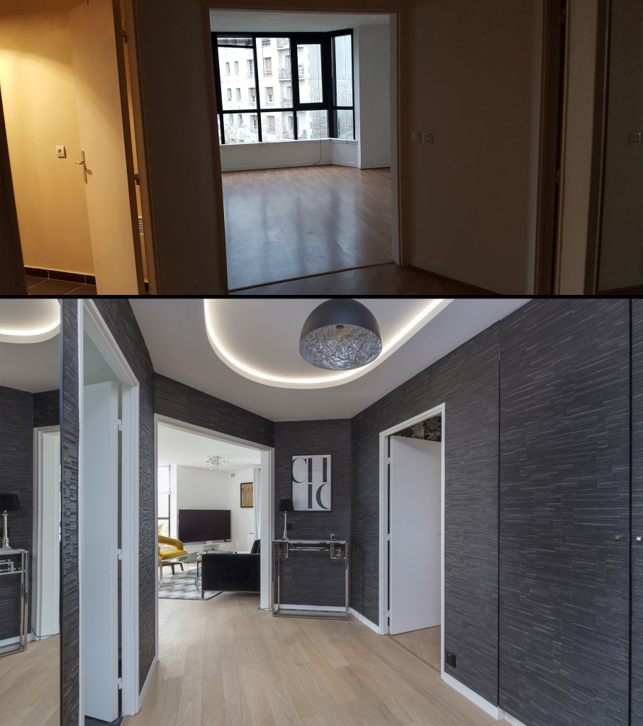 Rénovation complète et ameublement haut de gamme pour ce pied-à-terre familial situé à Courbevoie. Des lignes contemporaines, des matières nobles pour un esprit chic à la française. Une nouvelle fois, ces propriétaires basés à l’étranger m’ont laissé carte blanche pour repenser entièrement ce bien de 90m².