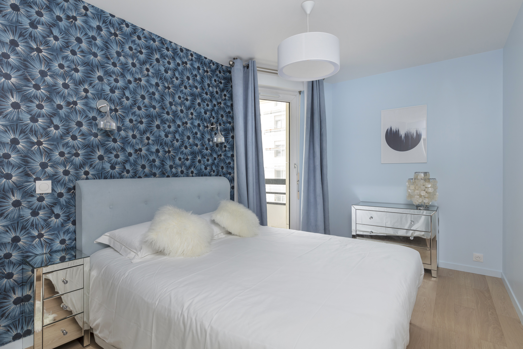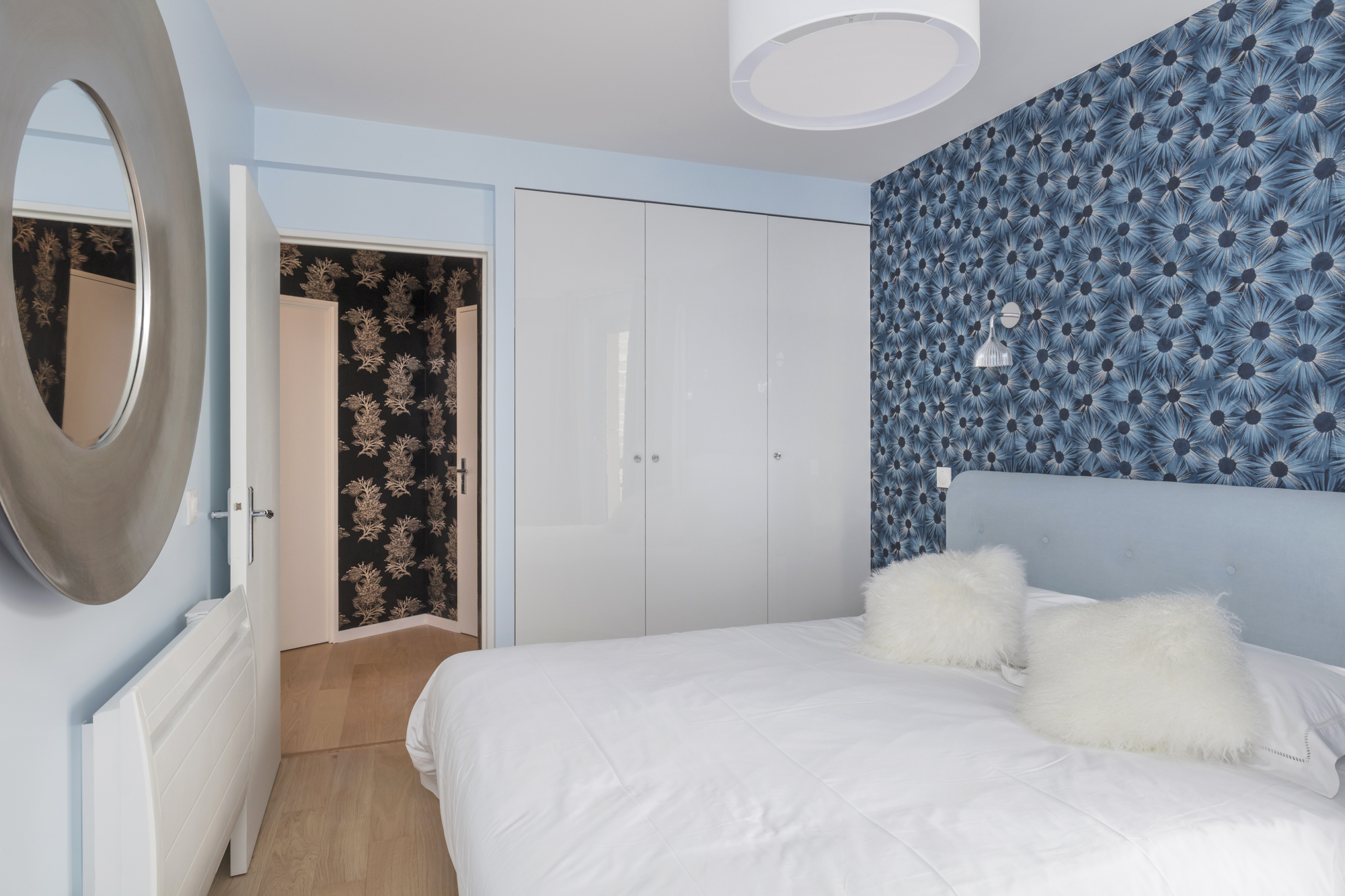Jeux de miroirs également pour cette chambre bleue
