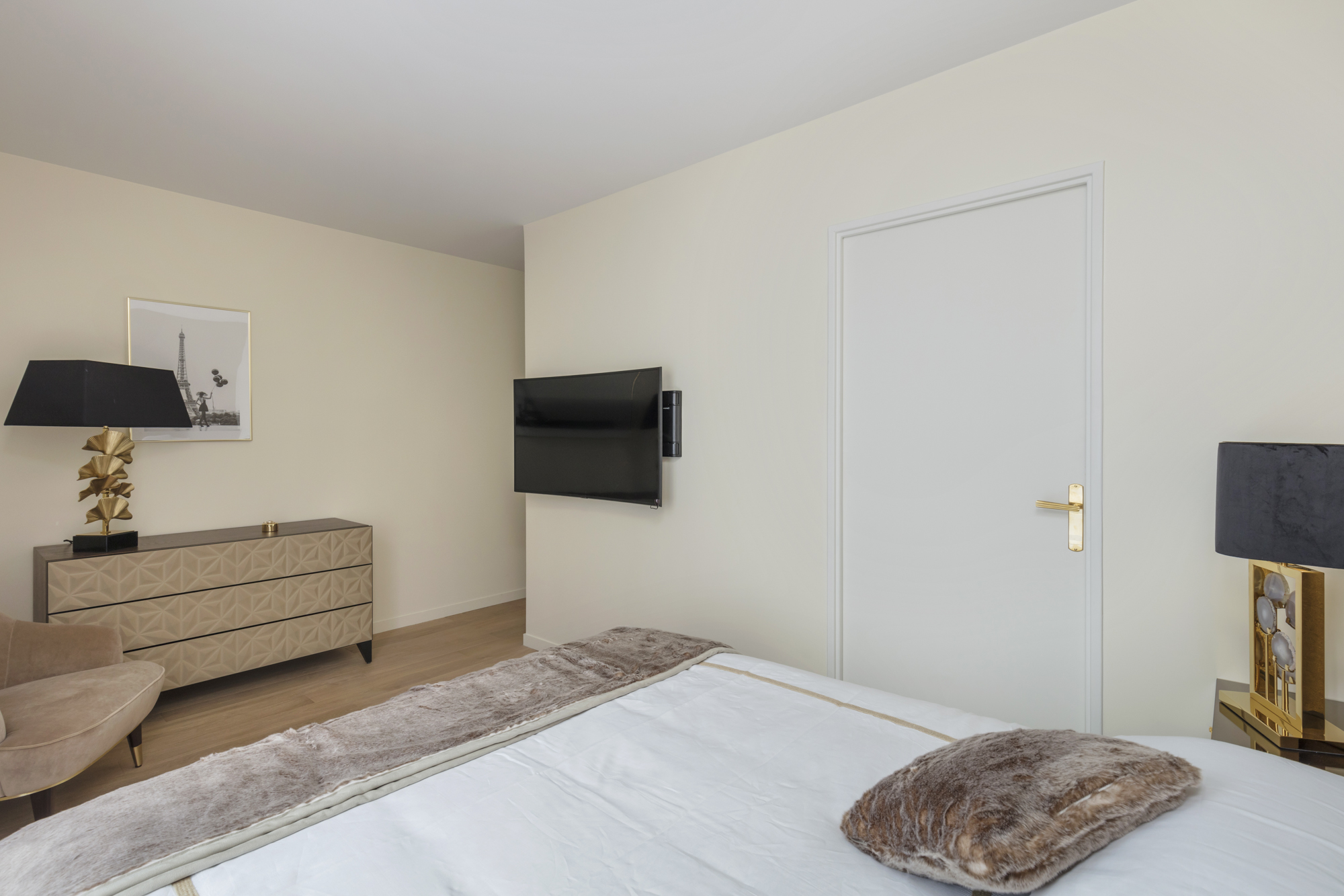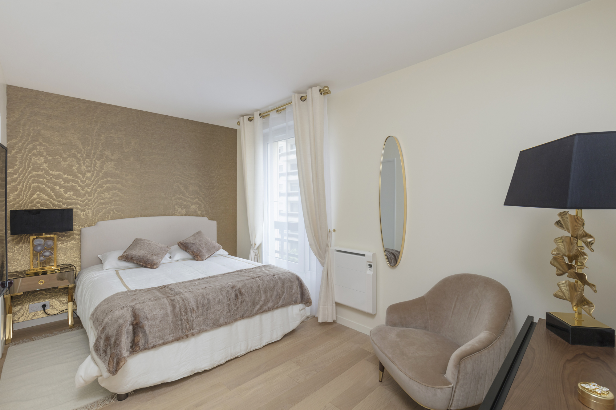 La chambre de la suite parentale en doré et beige