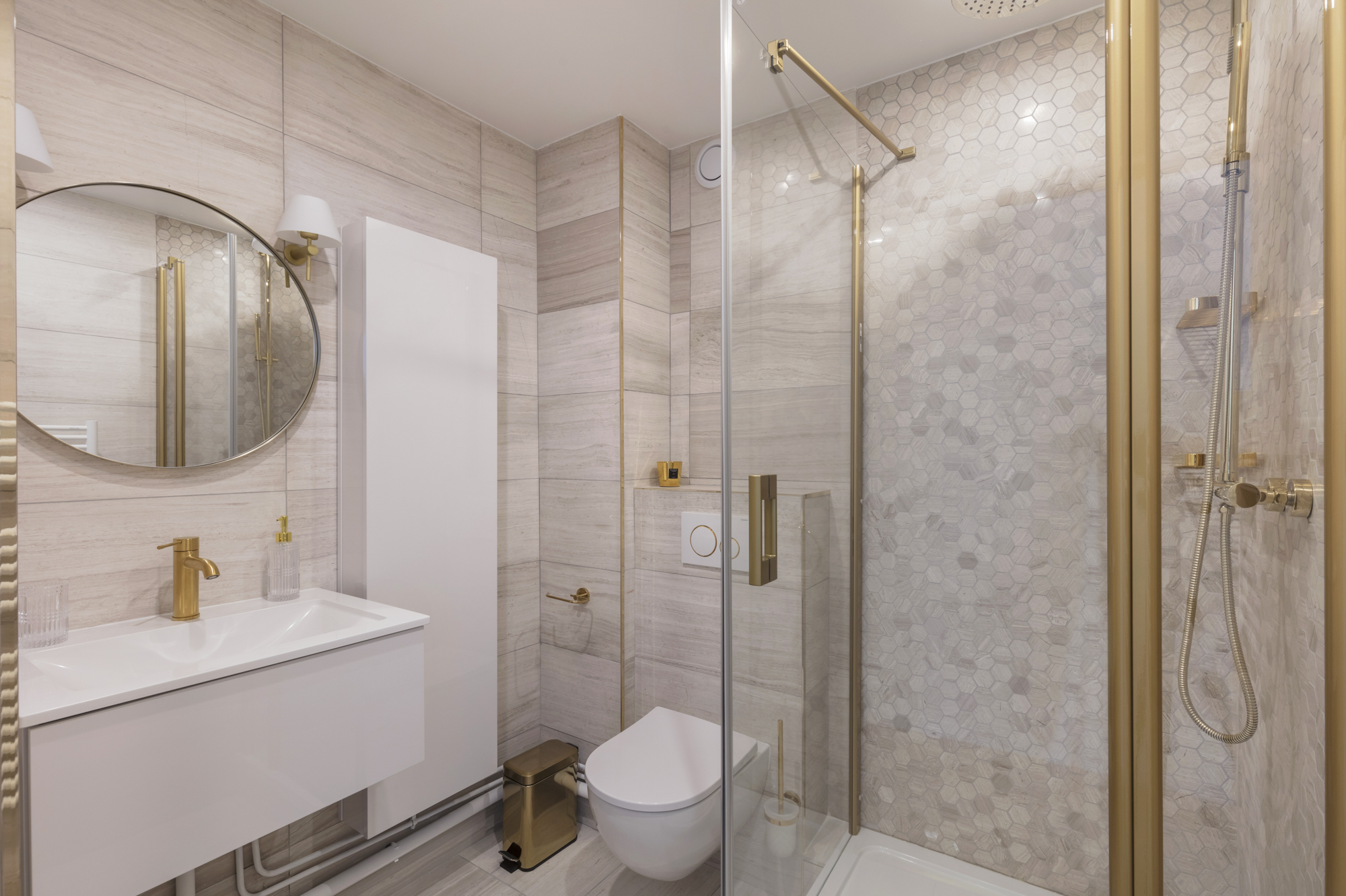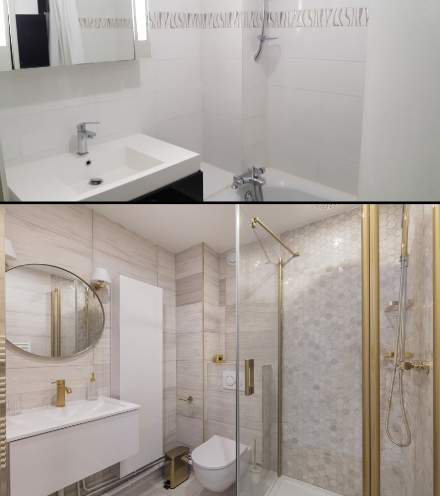 La salle de bain de la suite parentale reprend les codes de la chambres: marbre grège et touches d’or