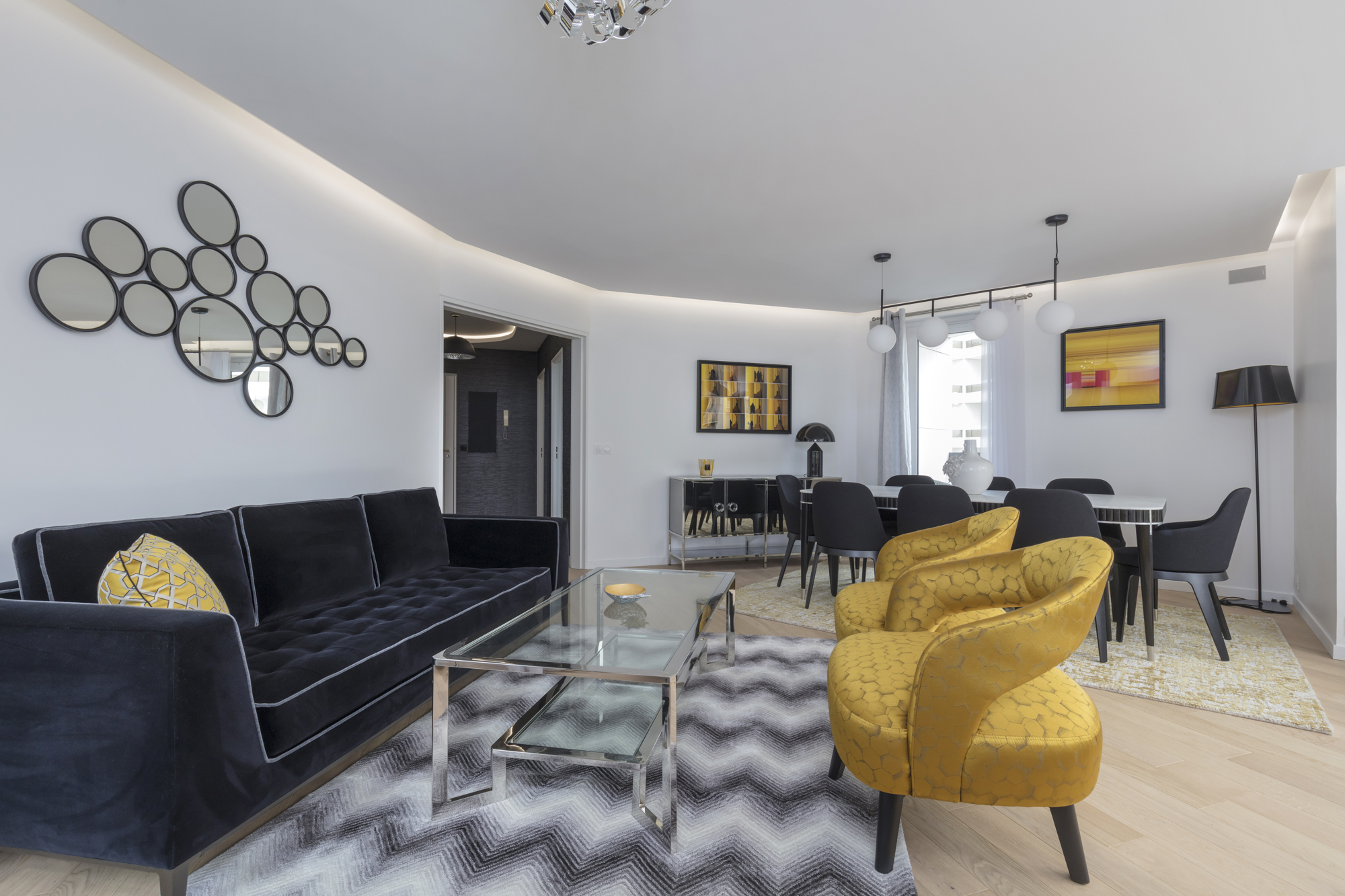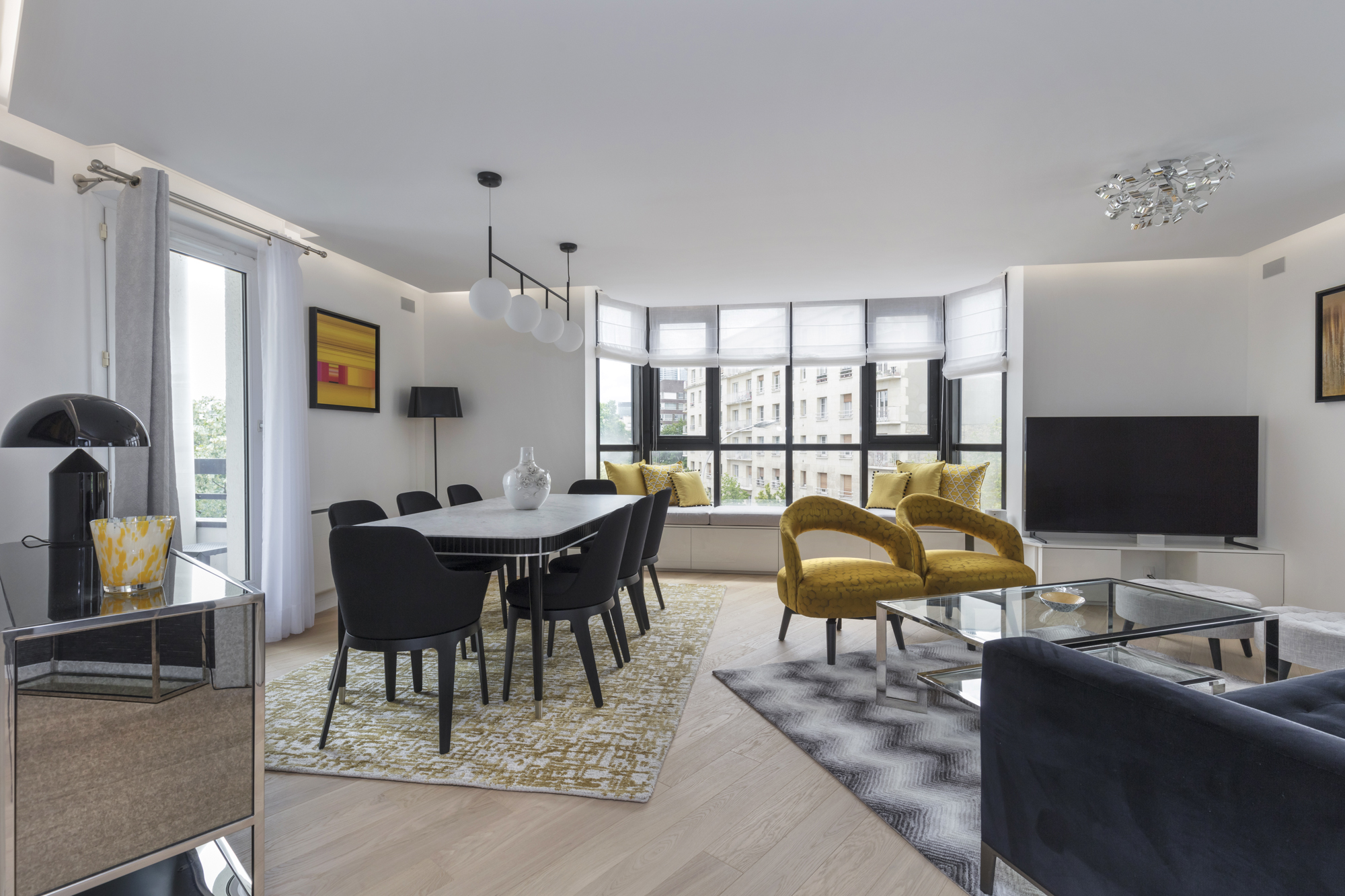 Le séjour baigné de lumière grâce à son bow-window et aux touches de jaune mangue