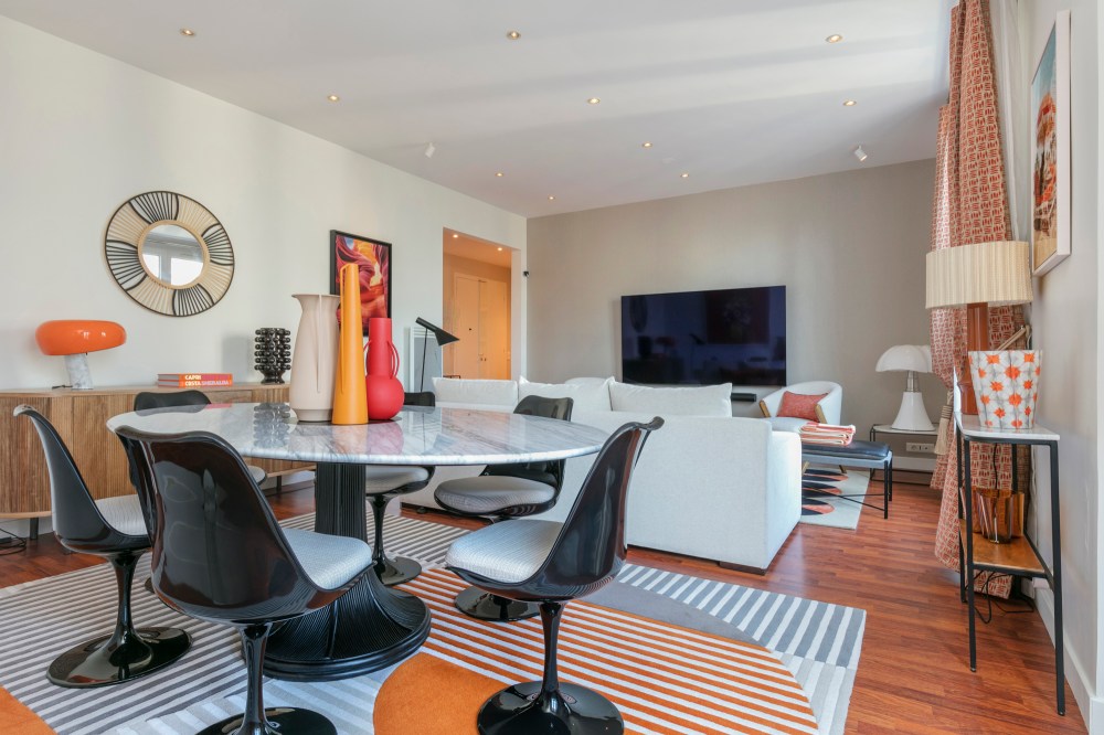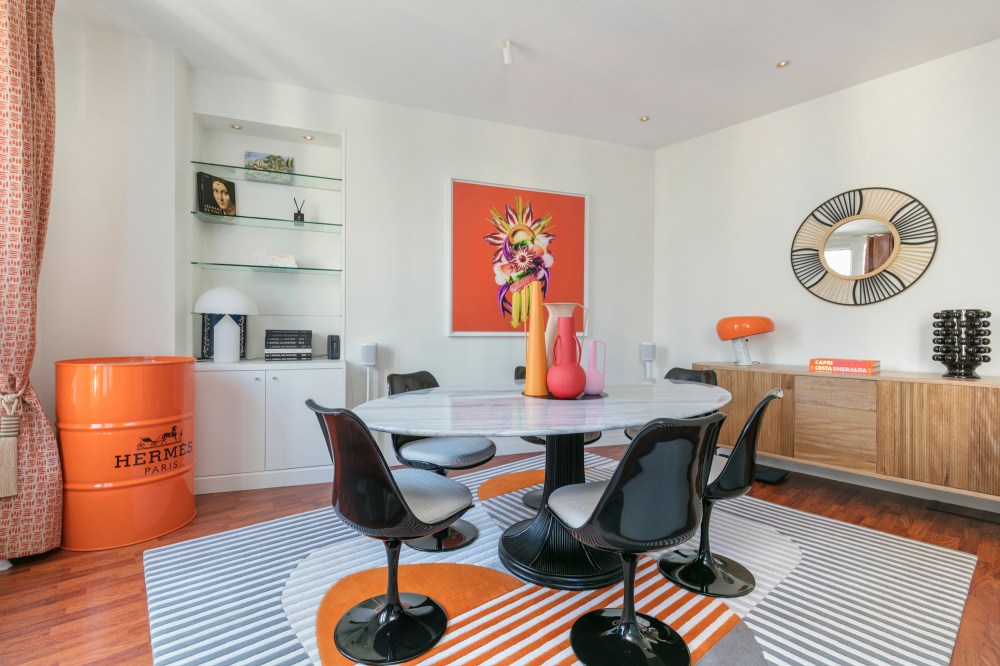Le séjour dans un contraste de beige et orange, souligné de touches de noir
