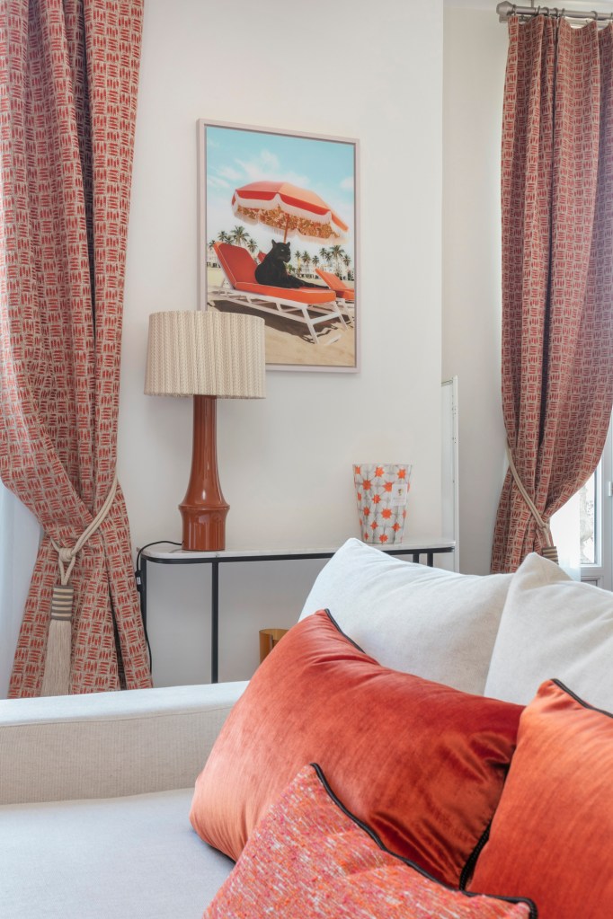 Détails du salon avec ces coussins et rideaux sur-mesure qui amènent le regard vers la lampe en laque de Chine et cette œuvre d’art vintage.